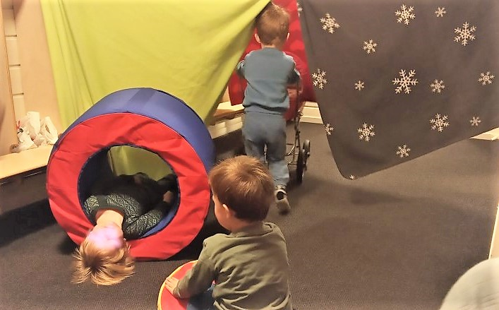 En hinderløype kan legge til rette både for allside erfaringer med hele kroppen, og kunsten å inkludere hverandre i køen og vente på tur. De ser spent på om barnet foran kommer seg over hindringen med hjelp fra en støttende voksen.