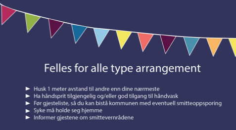 Dersom du eller din organisasjon skal ha et arrangement på et offentlig sted, du har er privat arrangement eller driver en organisert fritidsaktivitet, må du følge regler for smittevern. Her finner du mer om ditt ansvar som arrangør.