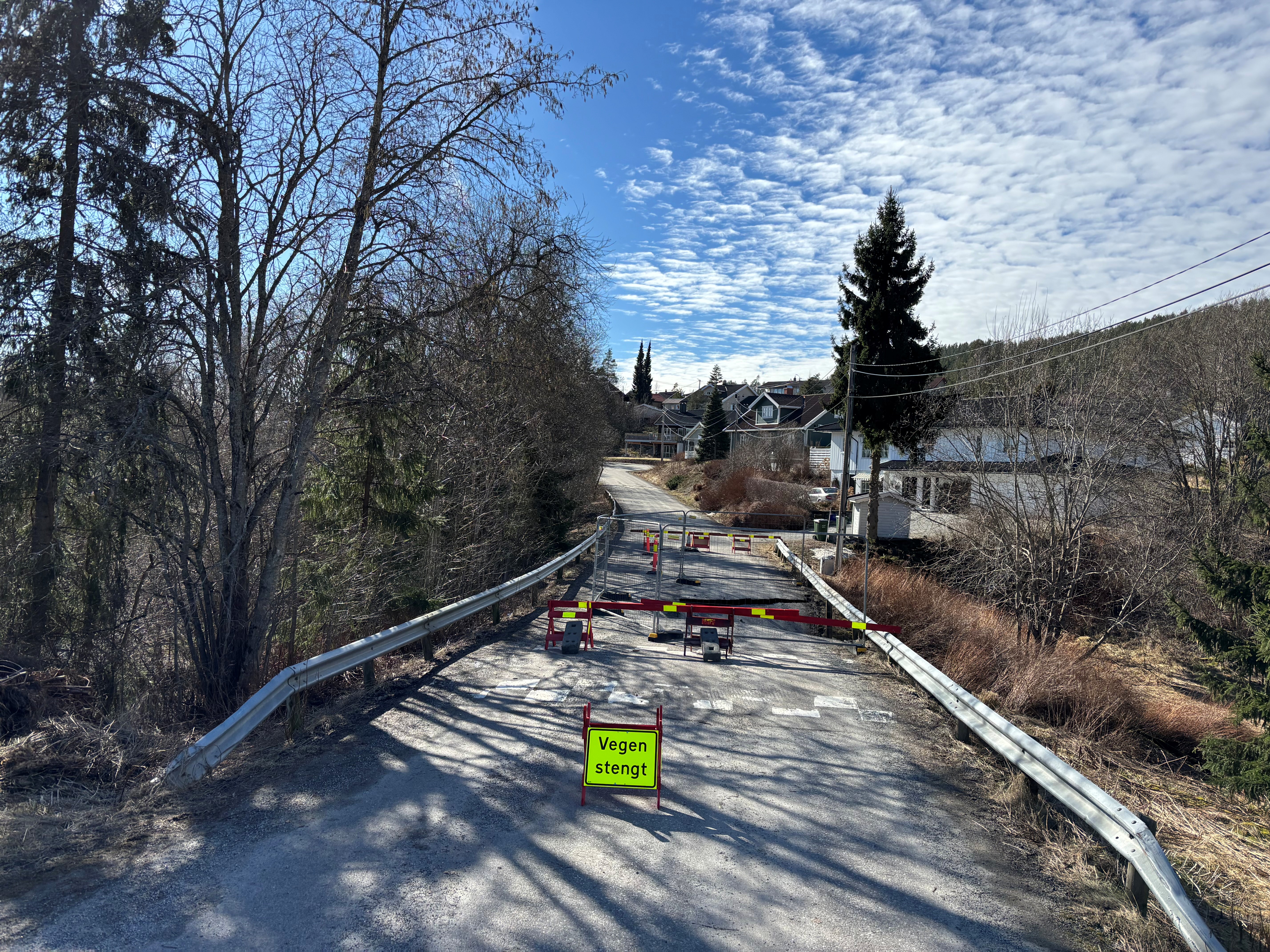 Etter flommen fredag 13. mars har Einerhaugveien på Bjørkelangen vært stengt ved undergangen til lysløypa. Bekken er ledet i rør forbi undergangen, men stålrøret har sviktet, noe som har ført til utvasking av masser under veien.