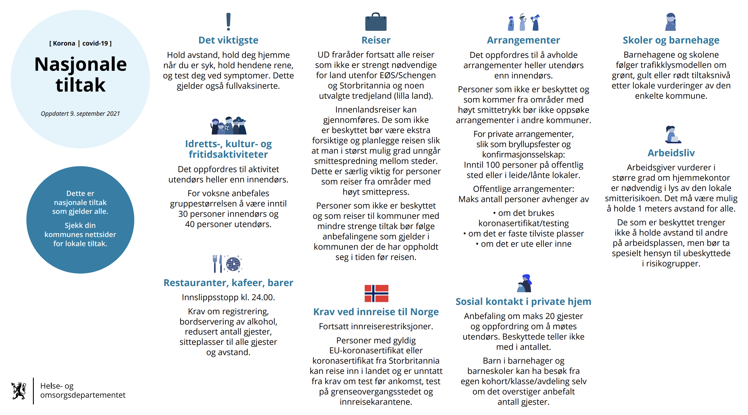 Har du fått med deg koronareglene som gjelder nå? Hvor mange gjester kan du ha hjemme, hvordan er det med skoler og barnehager, og kan du reise? Full oversikt over tiltakene som gjelder nå finner du her. Det aller viktigste: Hold avstand, hold deg hjemme når du er syk, hold hendene rene, og test deg ved symptomer. Dette gjelder også fullvaksinerte.