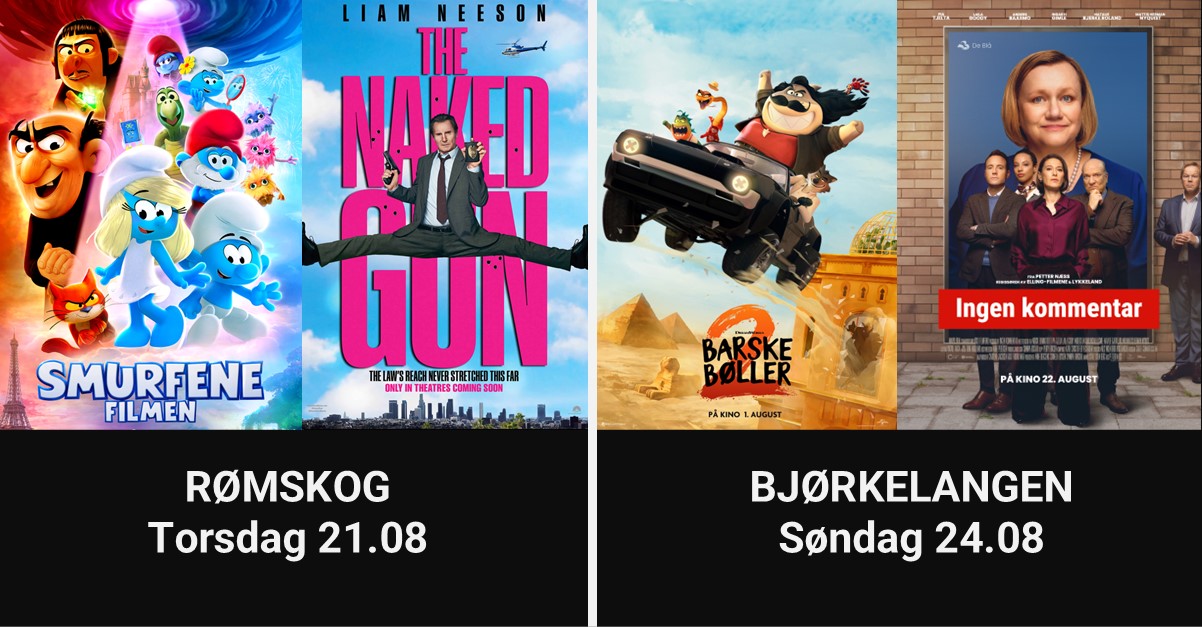 Mange og sterke filmtitler er i vente når sommeren er tilbakelagt. Vi gleder oss til å starte med barne- og familiefilmene Smurfene på i Rømskog kulturhus og Barske bøller 2 i Bjørkelangen kultursal. Her finnes både humør, spenning og action! Norske Ingen kommentar som må ses før valget, er en absurd komedie om en politisk virkelighet svært lik vår. En av høstens største titler, Blücher, et nervepirrende historisk drama om et avgjørende øyeblikk i Norges historie, gleder vi oss også til å se i våre kinosaler! Følg med, det blir en spennende kinohøst!