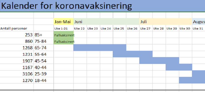 Her er Aurskog-Høland kommune sin vaksinekalender for tiden fremover. Her kan du se når det er forventet at din aldersgruppe skal få sin første koronavaksine. Per dags dato er det ni ukers intervall mellom første og andre dose.