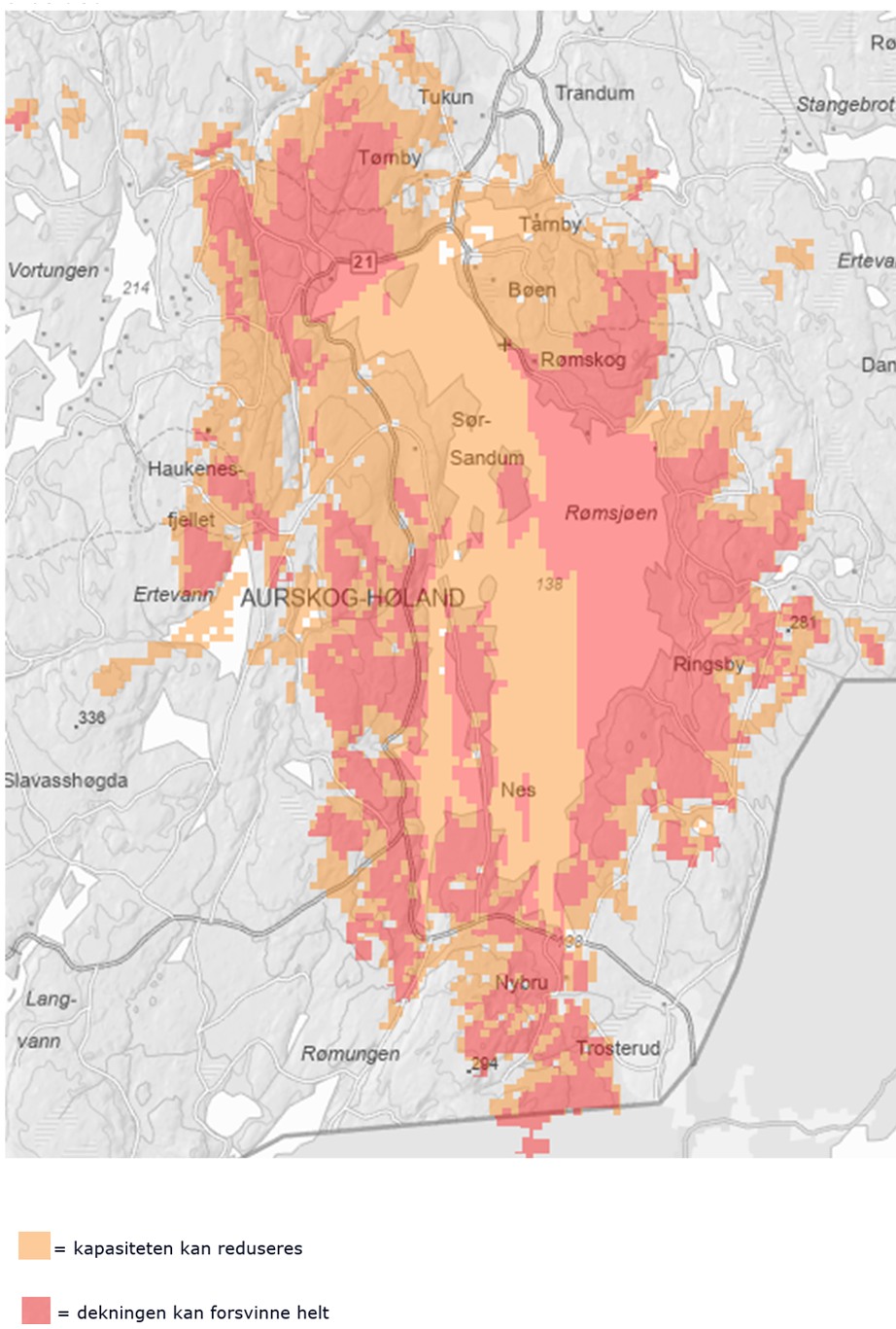 Under er et kartutsnitt av området som vil kunne oppleve periodevis redusert kvalitet eller manglende dekning i forbindelse med arbeidet.