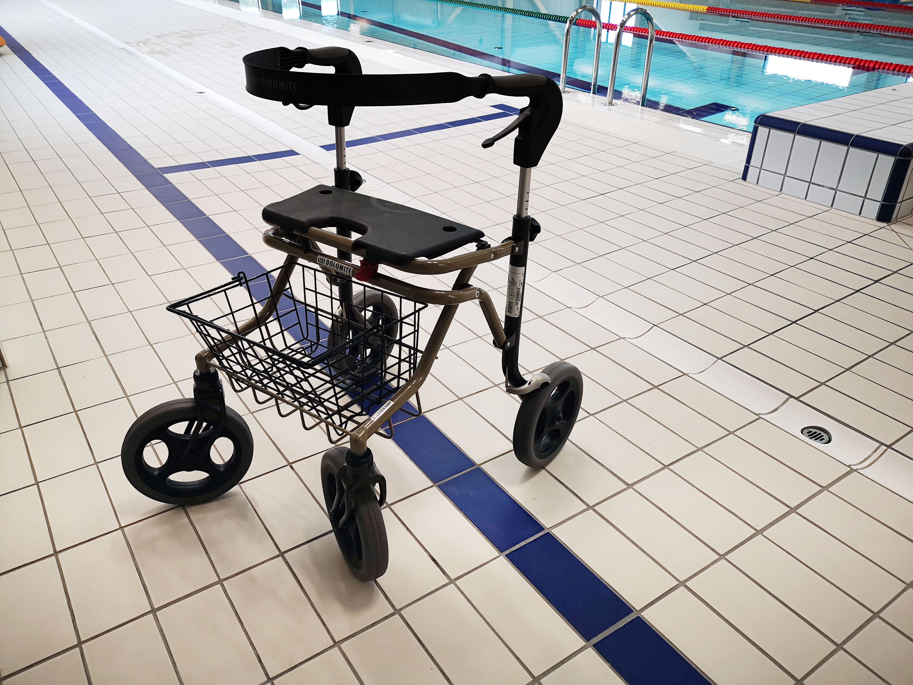 To solide rullatorer for våtsone er nå til utlån når man besøker Bjørkebadet. Om du trenger ekstra støtte når du går mellom garderobe og basseng eller vil ha muligheten til å sette deg ned underveis, så er rullatorene ideelle.