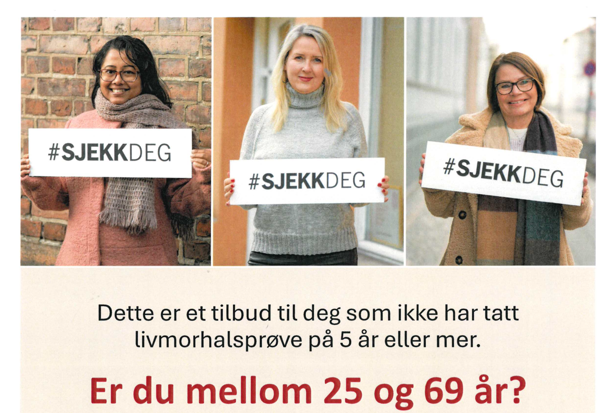 Du kan få tatt screening / celleprøve hos jordmor eller lege på helsestasjonen den 12/3-26 fra kl. 08.30 til 17.00. Du må bestille time først. Send SMS til 989 09 325 (jordmor) så finner vi en tid som passer. VELKOMMEN!